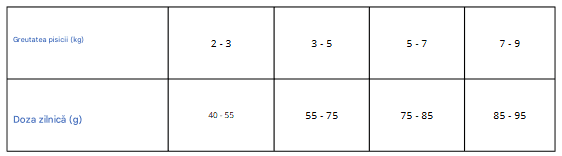 vitamina A (3a672a) 20 000 UI, vitamina D3 (E671) 800 UI, vitamina E (3a700) 600 mg, vitamina C (3a312) 300 mg, taurină (3a370) 2 500 mg, L-carnitină (3a910) 50 mg, clorură de colină (3a890) 2 500 mg, biotină (3a880) 2 mg, vitamina B1 (3a821) 10 mg, vitamina B2 12 mg, niacinamidă (3a315) 50 mg, D-pantotenat de calciu (3a841) 40 mg, vitamina B6 (3a831) 10 mg, acid folic (3a316) 2 mg, vitamina B12 0,04 mg, zinc (3b606) 120 mg, fier (3b106) 45 mg, mangan (3b504) 55 mg, iodură de potasiu (3b201) 4 mg, cupru (3b406) 10 mg, seleniu (3b8. 10) 0,2 mg, L-metionină (3c305) 2 000 mg. Valoarea energetică metabolizabilă: 3 640 kcal/kg.