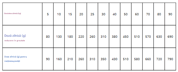 Proteină brută 27,0 %, grăsime brută 9,0 %, umiditate 10,0 %, cenușă brută 5,5 %, fibre brute 9,5 %, calciu 1,2 %, fosfor 0,8 %, sodiu 0,3 %, acizi grași omega-3 0,3 %, acizi grași omega-6 1,5 %, EPA (20:5 n-3) 0,02 %, DHA (22:6 n-3) 0,05 %.