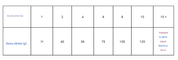 Proteină brută 29 %, grăsime brută 18 %, umiditate 10 %, cenușă brută 8,4 %, fibre brute 2,5 %, calciu 1,6 %, fosfor 1,3 %, acizi grași omega-3 1,1 %, acizi grași omega-6 2,3 %.