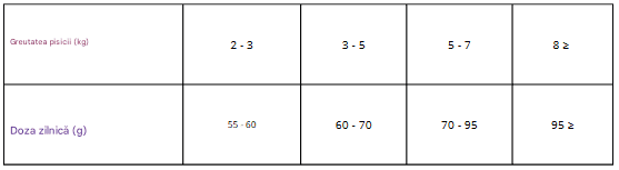 Vitamina A (3a672a) 20000 UI, vitamina D3 (3a671) 850 UI, vitamina E (3a700) 600 mg, vitamina C (3a312) 250 mg, taurină (3a370) 2150 mg, biotină (3a880) 1,7 mg, zinc (3b606) 140 mg, mangan (3b504) 50 mg, železo (3b106) 50 mg, měď (3b406) 10 mg, iod (3b201) 3,5 mg, seleniu (3b810) 0,16 mg, L-metionină (3c305) 4000 mg. Omega-3: 0,20 %, Omega-6: 2,25 %.