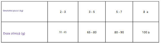 Vitamina A 20000 UI, vitamina D3 850 UI, vitamina E 600 mg, vitamina C 250 mg, taurină 2150 mg, biotină 1,7 mg, zinc 140 mg, mangan 50 mg, fier 50 mg, cupru 10 mg, iod 3,5 mg, seleniu 0,16 mg, L-metionină 4000 mg, omega-3: 0,2%, omega-6: 2,25%.