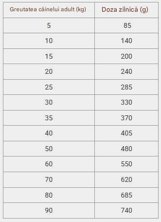 Proteină brută 26 %, grăsime brută 14 %, cenușă brută 7 %, fibre brute 2,8 %, umiditate 9 %, calciu 1,1 %, fosfor 0,9 %, sodiu 0,2 %, acizi grași omega 3 0,1 %, acizi grași omega 6 2,4 %