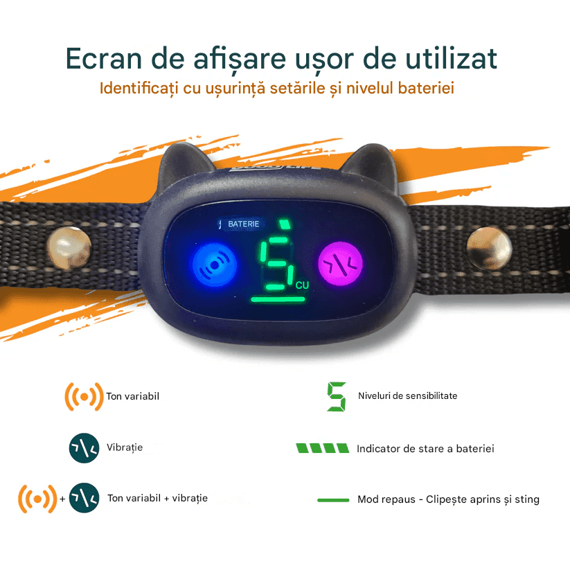 Această zgardă anti-lătrat oferă 3 niveluri de vibrație și 6 tonuri de avertizare de frecvențe diferite. Sunetul poate fi utilizat singur, împreună cu vibrațiile sau poate fi dezactivat complet. Pentru cele mai bune rezultate, se recomandă utilizarea combinată a sunetului și vibrațiilor. Totuși, vibrațiile singure sunt suficiente pentru a atrage atenția câinelui, fără a-l răni sau speria. Zgarda detectează automat lătratul și, dacă este necesar, inițiază un ciclu de corecție. Dispune de un ecran LED ușor de citit, care afișează setările curente ale zgarzii.